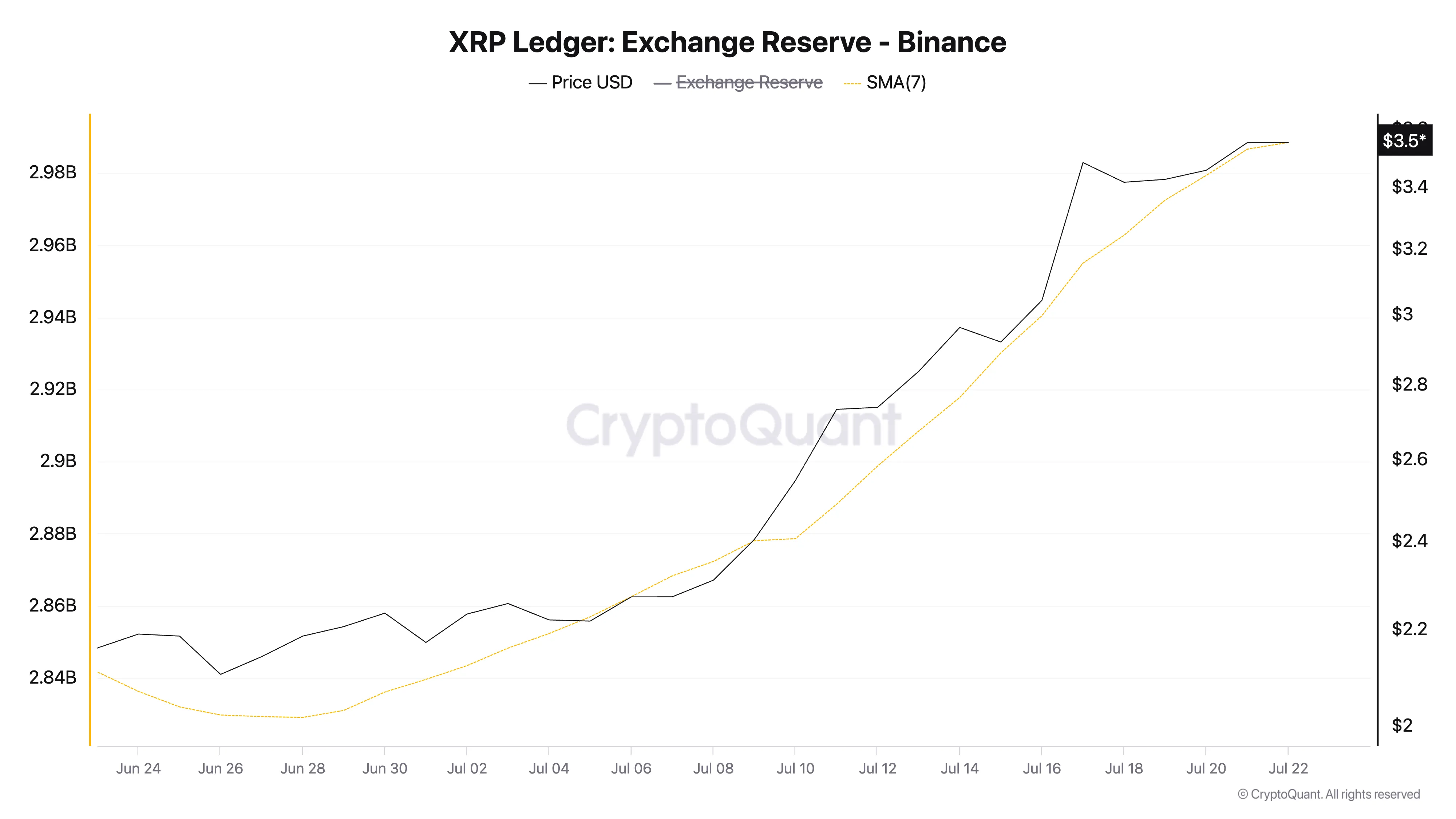 首先,XRP在头部交易所币安的储备量出现急剧攀升,达到年内最高水平。根据CryptoQuant数据,以7日移动平均线计算的XRP交易所储备量在7月22日达到298万枚的年度峰值,按当前市价计算价值超过1000万美元。