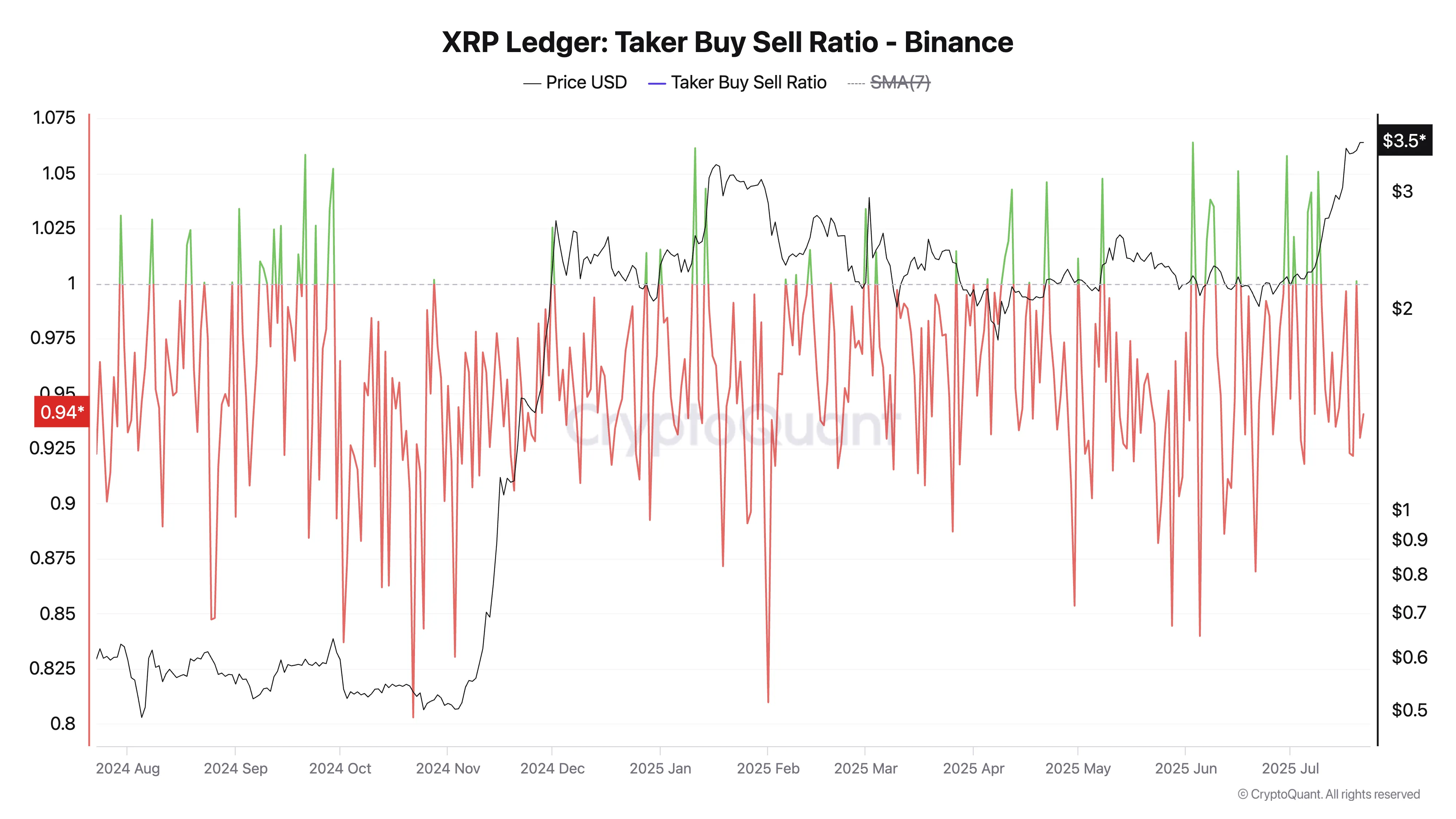 此外,CryptoQuant数据显示自7月10日起,XRP的主动买入/卖出比率持续低于1。截至发稿,该指标为0.94。