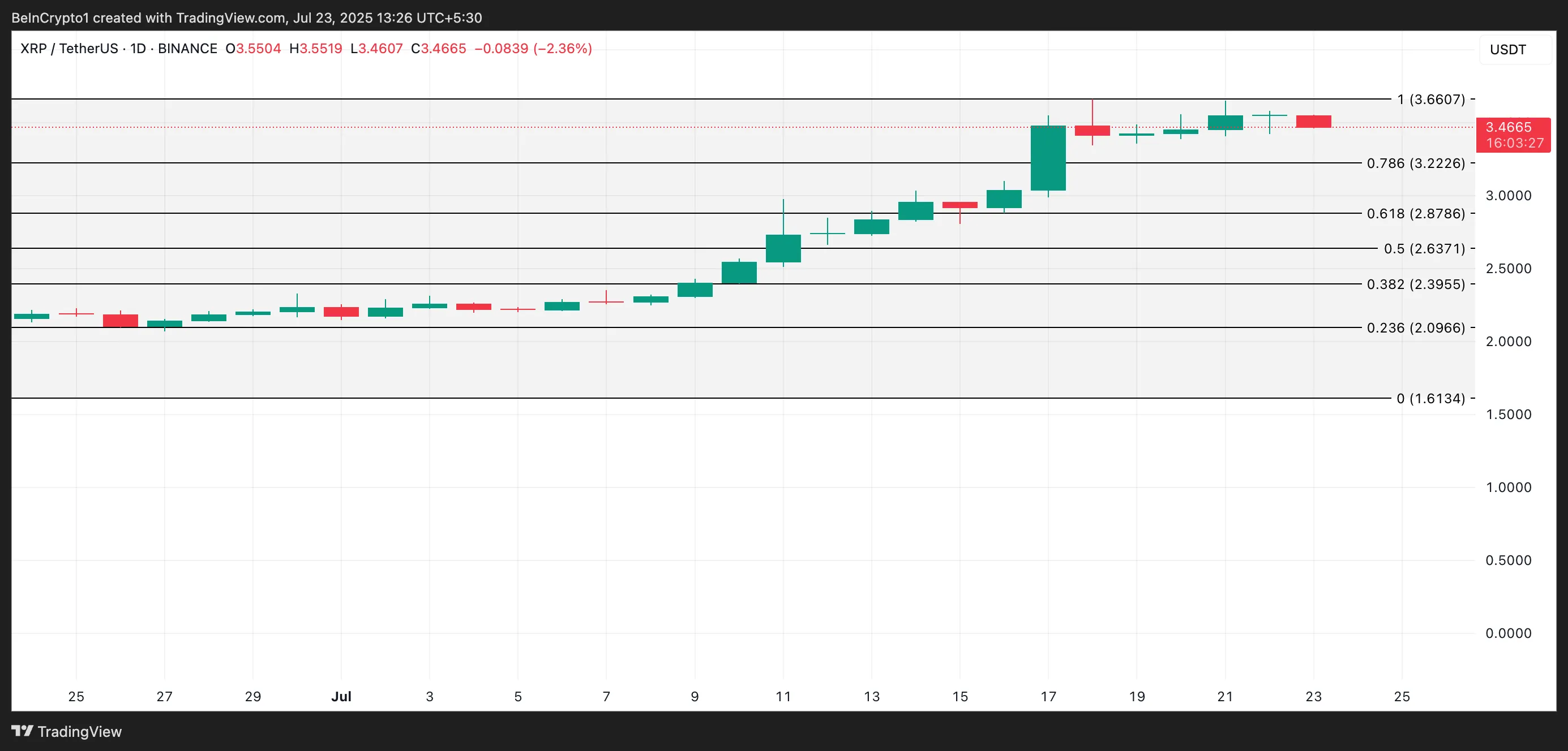 当前XRP报价3.47美元,略低于3.66美元的历史高点。但不断累积的卖方压力增加了短期回调至3.22美元支撑位的可能性。若该支撑位失守,XRP可能进一步下探2.87美元附近。