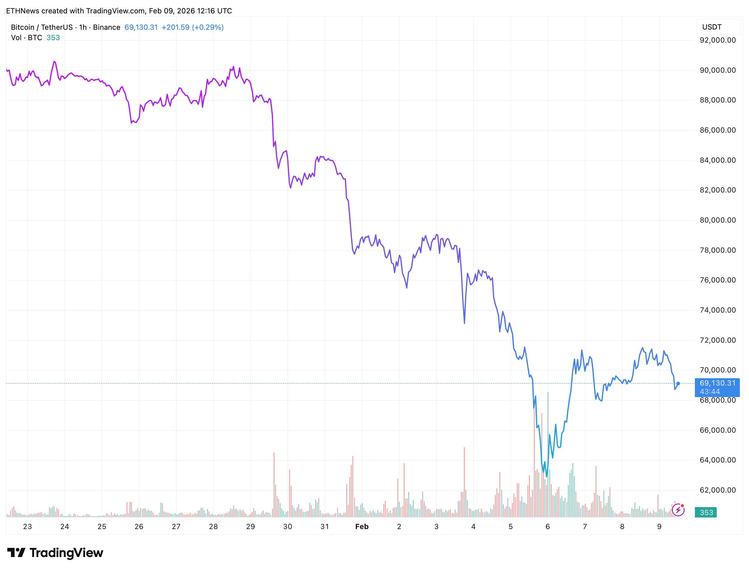 截至撰稿时,比特币交易价格约为69,130美元,此前一度因剧烈抛售跌至60,000美元低点区域。本次下跌始于一个下降三角形态的破位,随着看跌动能加剧而加速下探,直至买盘在结构支撑附近入场。