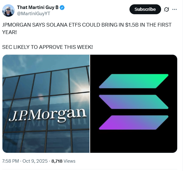 摩根大通预计,Solana ETF在首年将吸引约15亿美元资金流入。该行估算基于REX Osprey Solana ETF的早期需求——该基金自7月推出以来已募集3.5亿美元。若预测准确,Solana将成为增长最迅猛的加密货币ETF市场之一。分析师指出,这种乐观前景反映了机构信心增强,同时也凸显Solana在数字体验领域的行业地位。