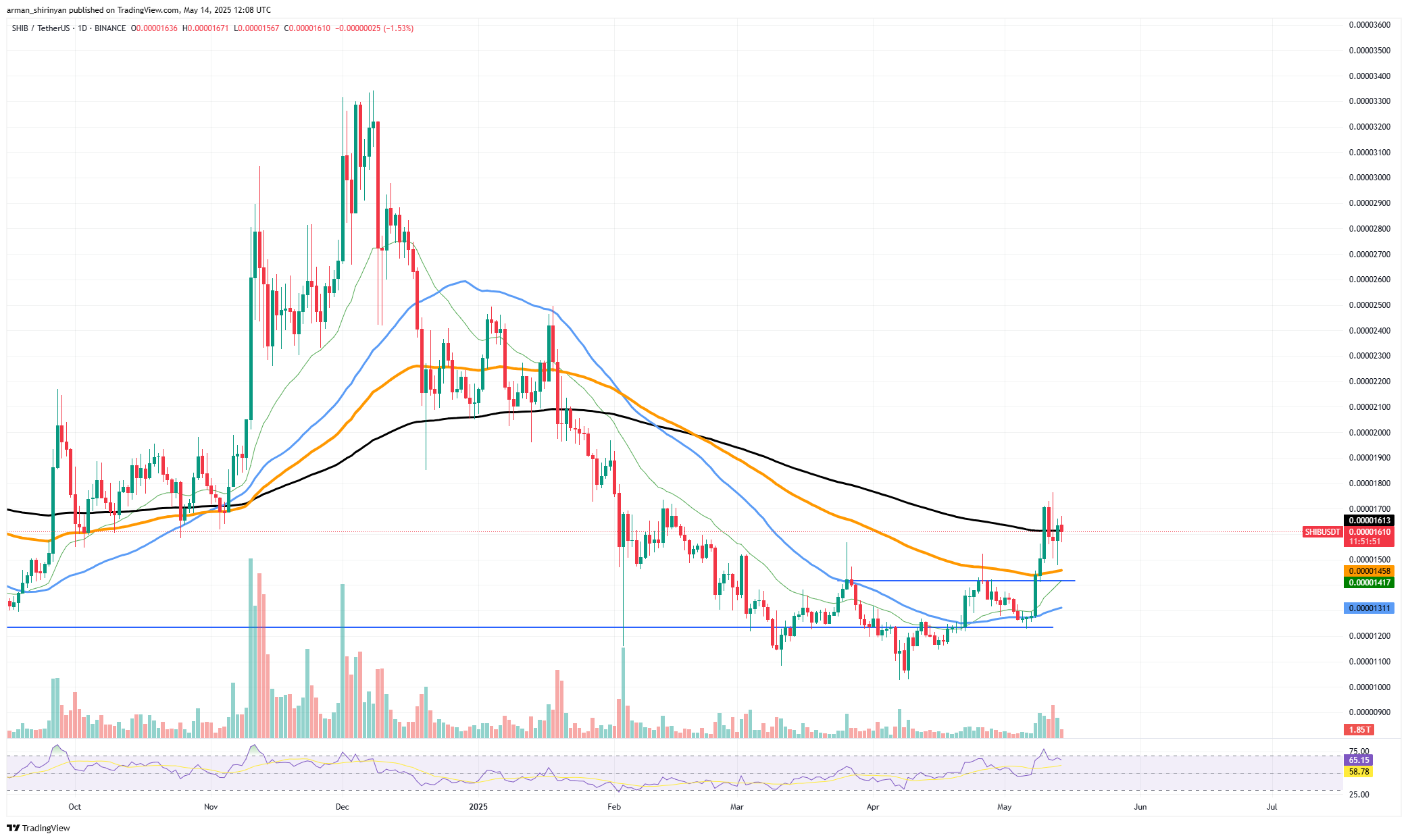 从技术角度来看,SHIB价格在5月12日达到最高点$0.000017,随后回落至当前水平$0.000015。在最初突破伴随的交易量激增后,交易量开始下降,相对强弱指数(RSI)显示出轻微的看跌背离。