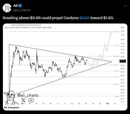 部分技术派将当前高位盘整视为看涨旗形,该形态通常在延续原趋势后实现突破,量度目标等同前段涨幅。若与三角形突破形成共振,ADA价格冲击1.50美元的几率将大增。