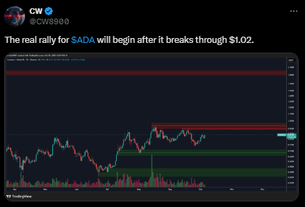 图表结构显示,若买方能在0.96-1.02美元区间消化抛压,ADA可能实现向上突破。分析师认为当前格局清晰可验证,并指出三大特征:明确的支撑位、邻近阻力位以及大额持有者参与度提升。