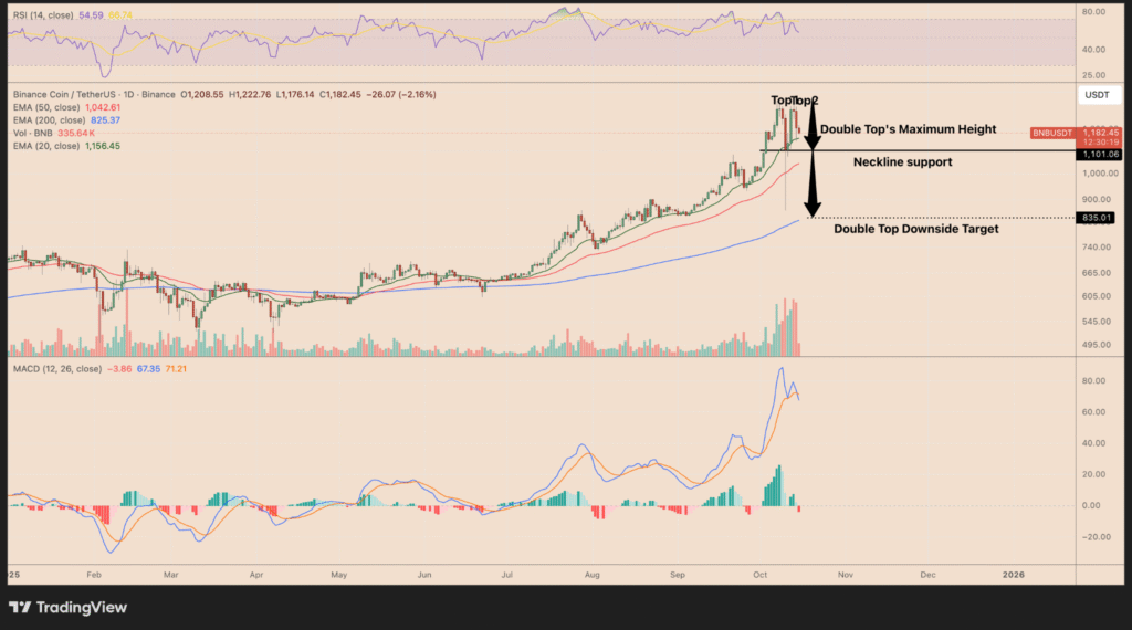 目前BNB仍坚守20日EMA(1,155美元)与50日EMA(1,042美元)上方。若能在该支撑区域企稳反弹,或可化解双顶形态风险。但若失守这些关键位,将进一步打开下行空间。