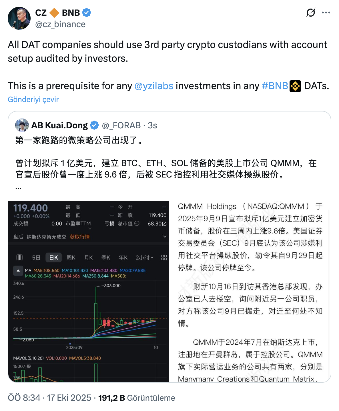 赵长鹏通过其X平台账号发表声明,主张所有DAT公司应与第三方加密托管机构合作,并强制要求投资者参与账户设置的审计流程。这一原则已成为YZi Labs在BNB生态系统中所有DAT投资的先决条件。面对加密市场对资产保管日益增长的担忧,赵长鹏的建议试图将去中心化金融原则与机构级安全机制相结合。
