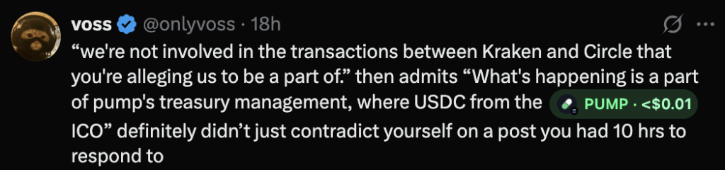 Sapijiju在11月24日的声明中表示:“我们并未套现任何资金——你所指控的Kraken与Circle之间的交易与我们无关。”这番回应针对Lookonchain持续40天的钱包动向追踪。该创始人澄清,来自PUMP首次代币发行的USDC被转移至不同钱包。