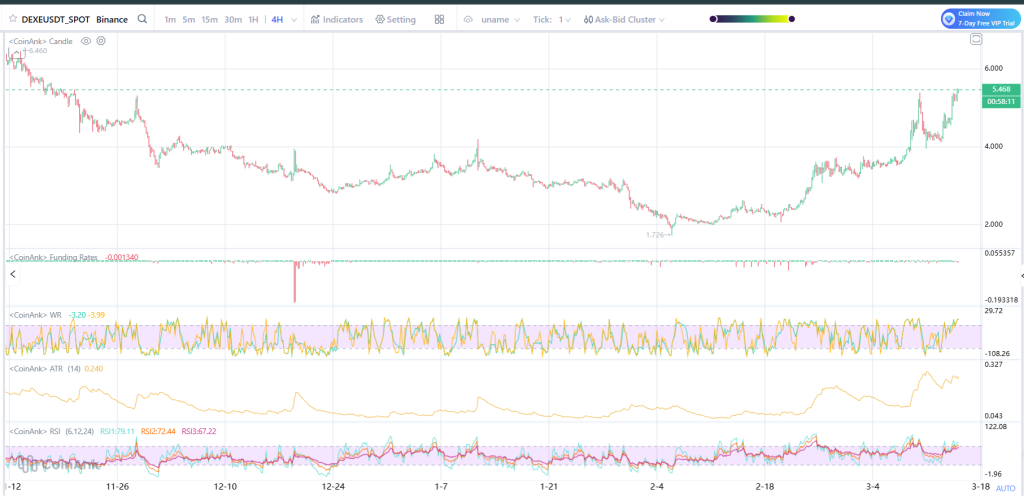 通过观察4小时图可见,DEXE在突破前已完成长期积累阶段。该代币价格历经数周下行趋势,在2美元区间构筑底部后迎来买盘介入。此后市场形成系列更高的低点,并于3月初重启强劲上升趋势。