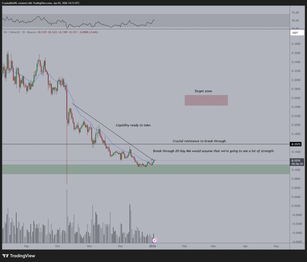 随着市场等待更多流动性释放,价格上涨潜力显著。交易者正密切关注0.24-0.26美元附近的关键阻力区域,期待SEI能维持在21日均线上方运行。