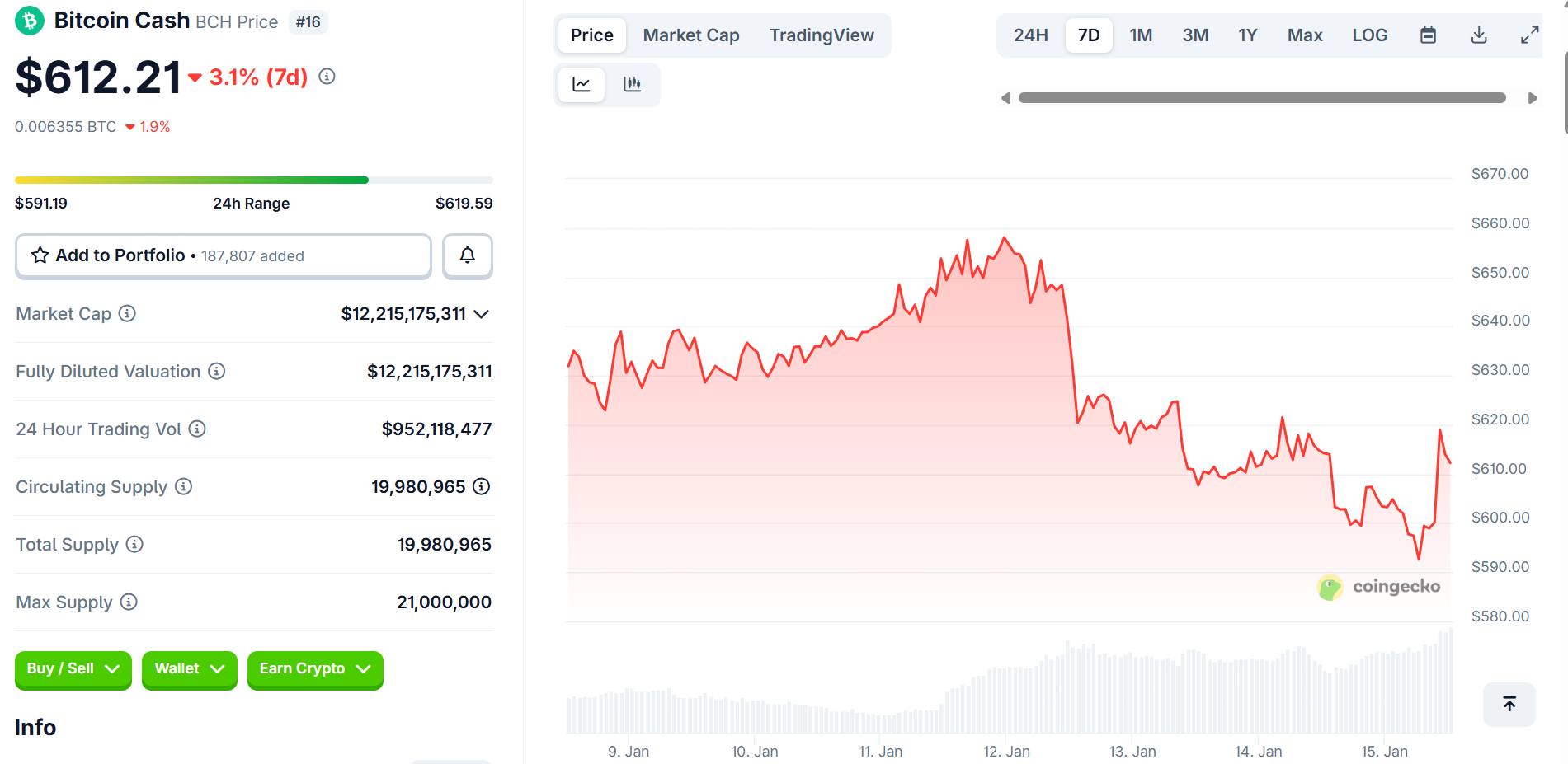 比特币现金目前交易区间在612至614美元之间,24小时交易量接近9.95亿美元,市值约122亿美元,使其保持在市值排名前12的资产之列。BCH近期在597至621美元之间震荡盘整。因此,任何关于比特币现金的价格预测,都取决于买家能否在611美元这一关键决策水平附近维持控制力。
