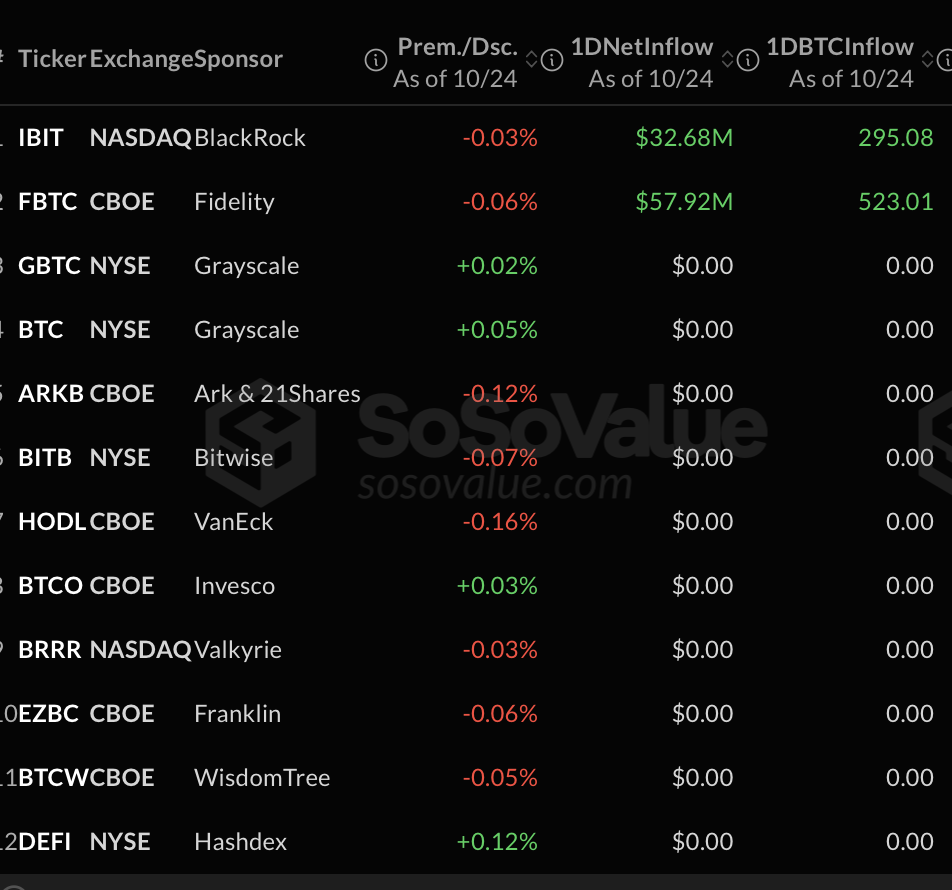 2025年10月24日SosoValue数据显示,美国现货比特币ETF出现选择性但意义重大的资金流入,其中富达的Wise Origin比特币基金(FBTC)和贝莱德的iShares比特币信托(IBIT)表现最为突出。两家机构共吸引近9100万美元新增资金,这表明尽管整体市场情绪仍显谨慎,机构需求依然持续。