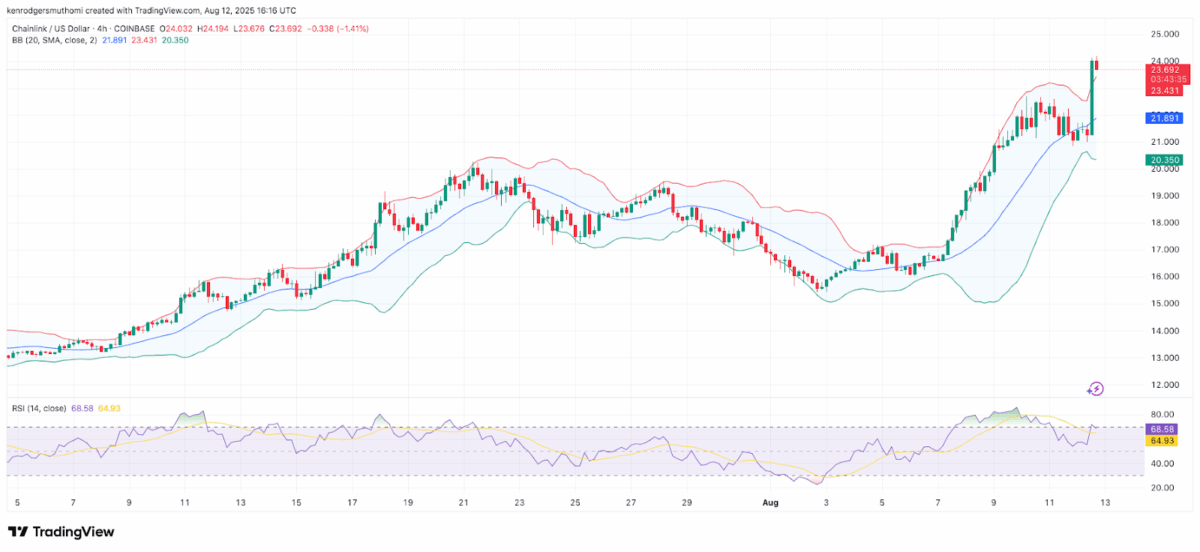 相对强弱指数目前为68.58,表明LINK正在接近超买区域。因此虽然市场情绪仍看涨,但若动能减弱可能出现短期回调。