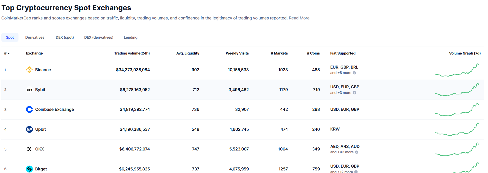 根据CoinMarketCap的顶级加密货币现货交易所名单,Bybit、OKX和Coinbase紧随其后。除了现货市场,币安在衍生品交易方面也排名第一。