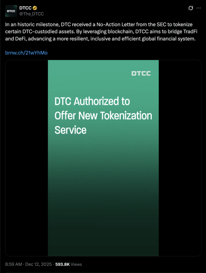 美国证券交易委员会刚刚批准了一项可能改变传统金融与加密领域的决定。该机构罕见地向存管信托与清算公司发出无异议函,为代币化股票、债券和ETF最早于2026年登陆美国市场扫清障碍。