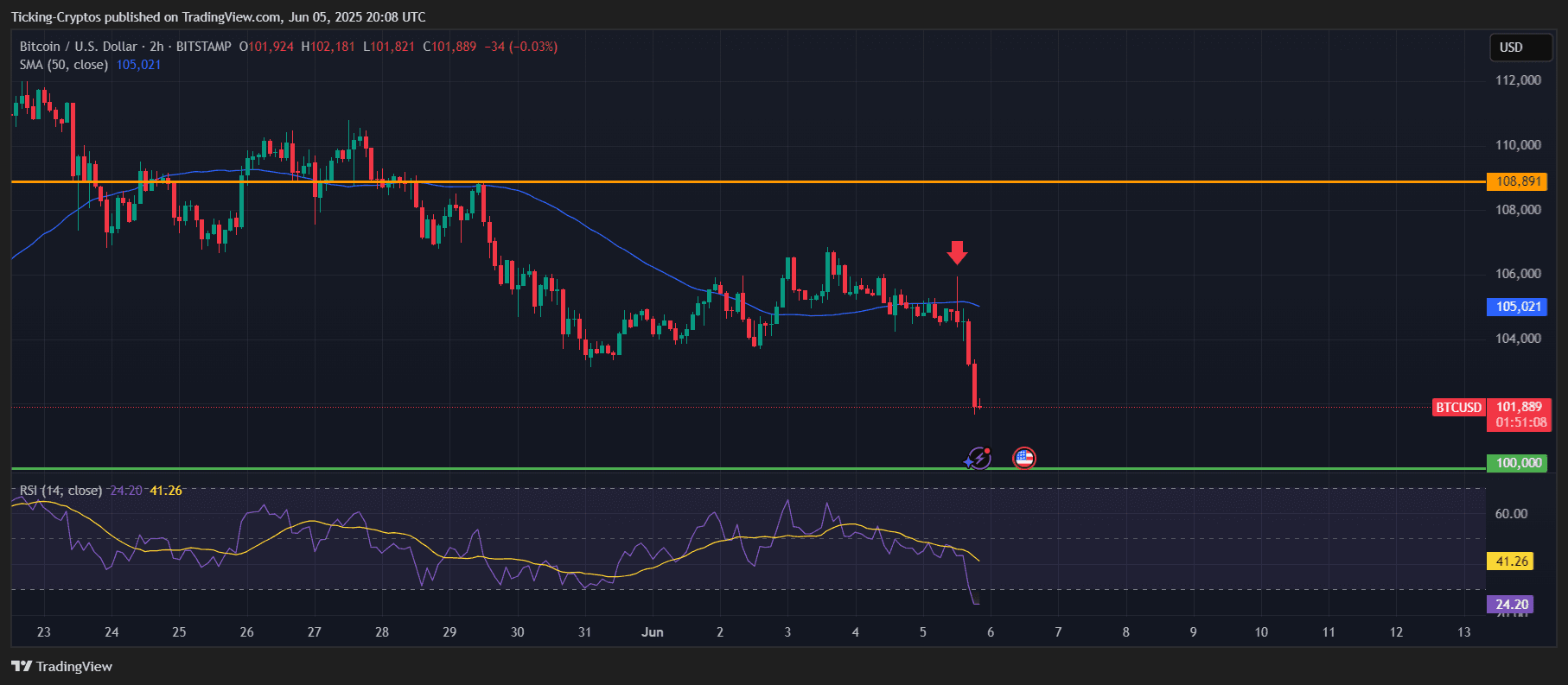 这场交锋已对加密市场造成实质性冲击。2025年6月5日马斯克爆料推文发布后,整体加密市场下跌3%,比特币跌幅达1.7%,价格回落至10.2万美元。分析师警告,若双方矛盾持续升级,比特币可能跌破10万美元心理关口。