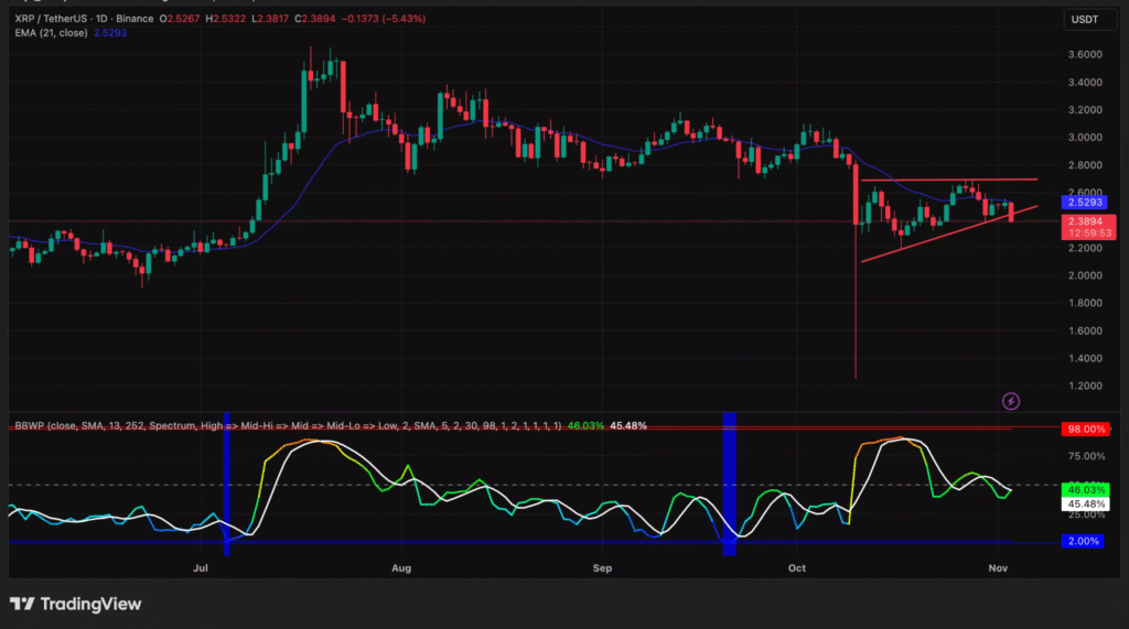 分析师阿里·马丁内斯指出,若2.40美元失守,2.25美元可能成为下一短期支撑位。XRP近期从2.38美元的反弹力度疲弱,成交量未能证实买盘复苏。