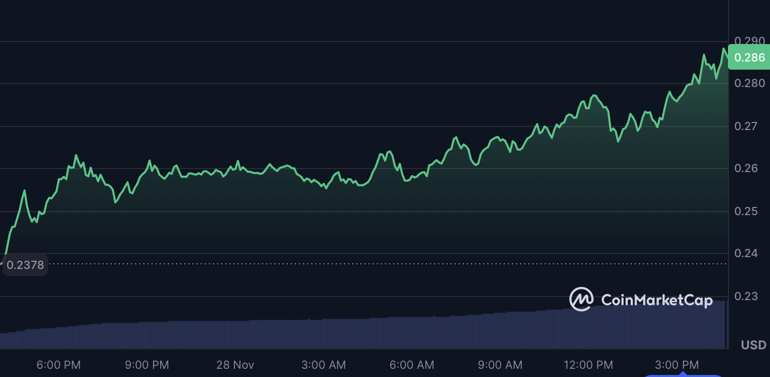 链上活动显著加速,转账量增长 72%,大户持仓持续积累助力价格突破。当前价格已明确站上 0.21 美元阻力位,MACD 指标走强与 RSI 接近 74 均确认看涨趋势,显示动能虽处高位但仍有延续空间。受 Biconomy 平台 8000 美元交易竞赛带来的流动性推动,交易量激增逾 200%。