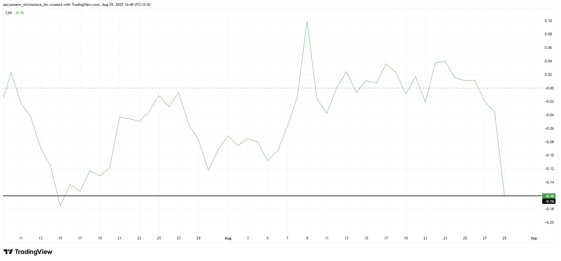 投资者行为显示出日益增长的悲观情绪,抛售压力使得这个替代币无法收复先前的支撑位。Chaikin资金流量指标(CMF)目前凸显出Pi币面临显著资金外流,该指标已跌至六周以来最低点,反映出强烈的抛售压力。当资产在关键支撑位附近交易时,投资者正在抽离资金,这削弱了价格反弹的可能性。