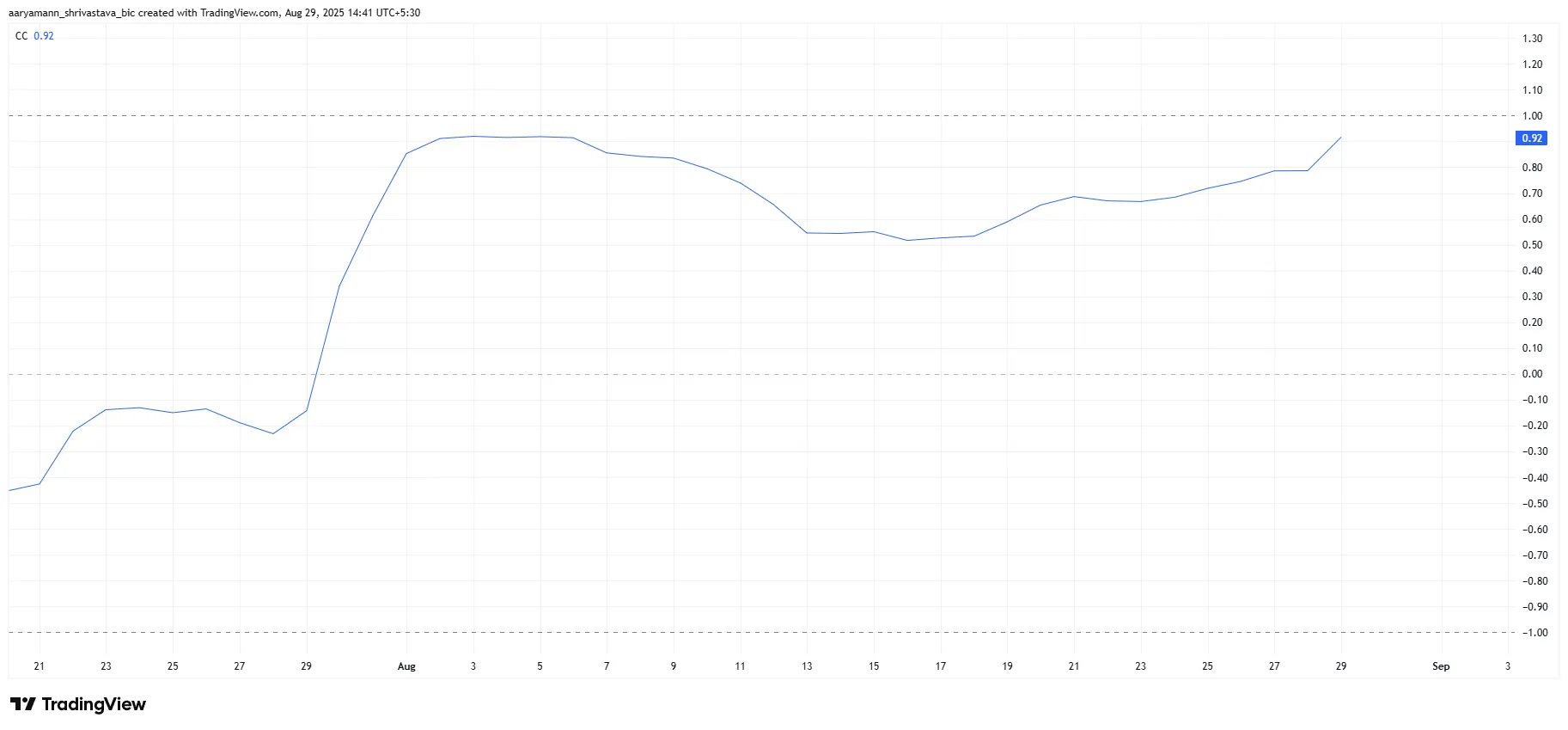 与比特币的高度相关性加剧了Pi币的脆弱性。目前相关系数达到0.92,这是今年以来的最高值之一。如此强烈的关联意味着Pi币极有可能跟随比特币的走势,无论其自身图表上出现何种独立发展或小型技术信号。