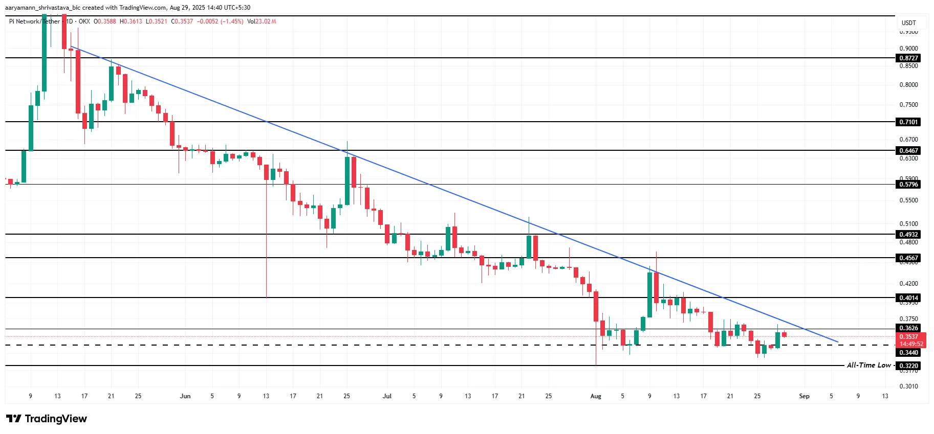 Pi币当前交易价格为0.353美元,略低于0.362美元的阻力位。这个替代币已被困在持续三个多月的下跌趋势中,四次尝试突破均告失败,使其在抛压加剧的情况下显得尤为脆弱,并保持在历史低点附近。
