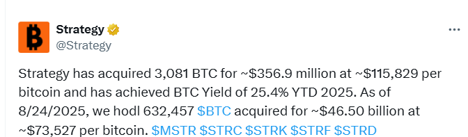 本次收购均价为每枚115,829美元,总耗资3.569亿美元。Michael Saylor于周日通过声明披露了此次交易。自2025年初至今,Strategy整体收益率已突破25%,印证了其投资方法论的有效性。
