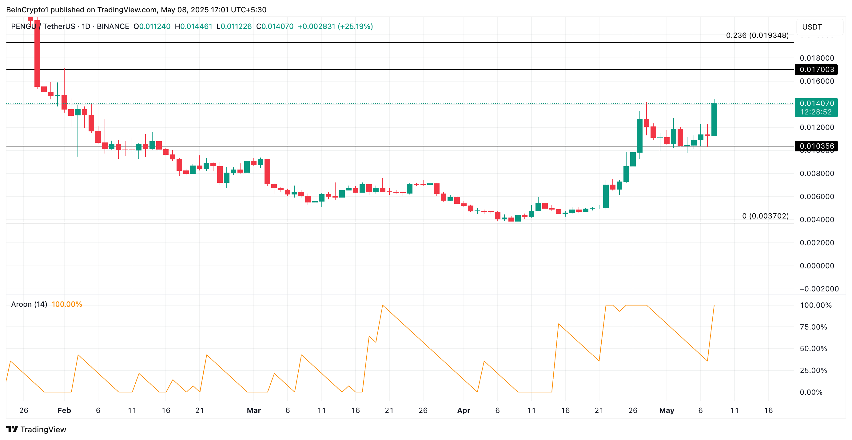 PENGU 在过去24小时内上涨28%,截至发稿时交易价格为0.014美元,创下三个月新高。在PENGU/USD日线图上,该代币的Aroon上升线达到100%,确认了这波涨势的强度。