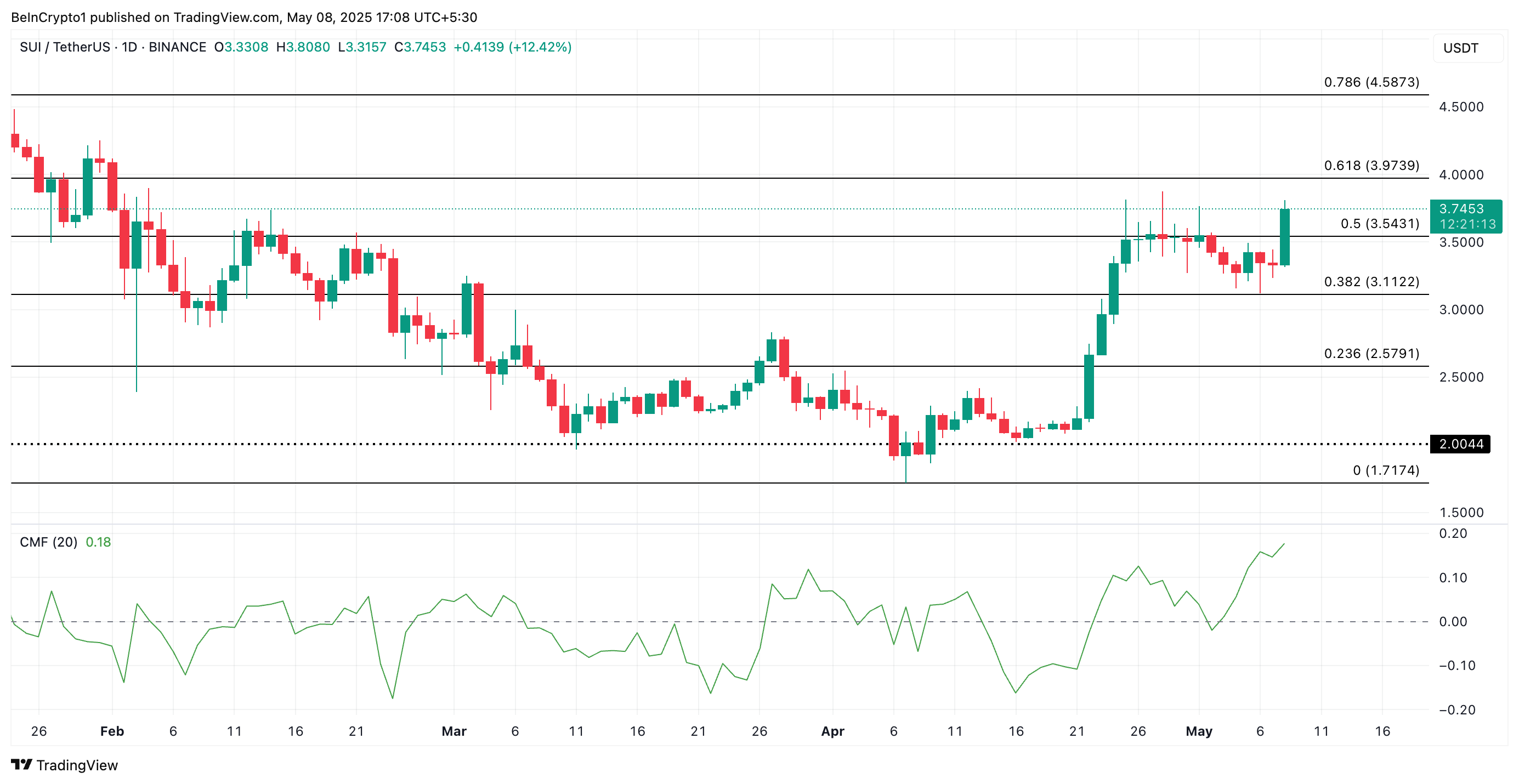 其不断上升的Chaikin资金流(CMF)证实了现货市场参与者对SUI的积累偏好。截至发稿时,这个衡量资金流入和流出资产的动量指标为0.18,是自1月20日以来的最高水平。