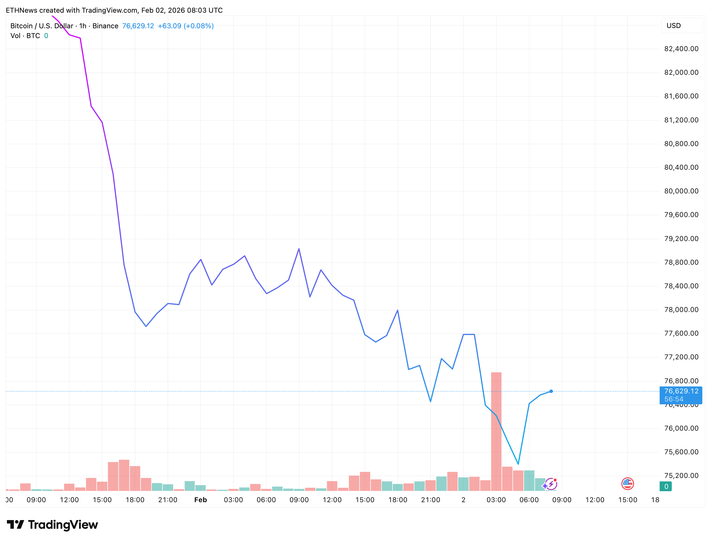 比特币在BTC/USD 1小时图表上交易于76,600美元附近,此前盘中经历急剧下跌,价格从82,000美元低位被冲刷至较低的整理区间。这一走势迅速展开,在价格于76,000美元中段区域附近找到暂时稳定之前,抛售压力持续加剧。