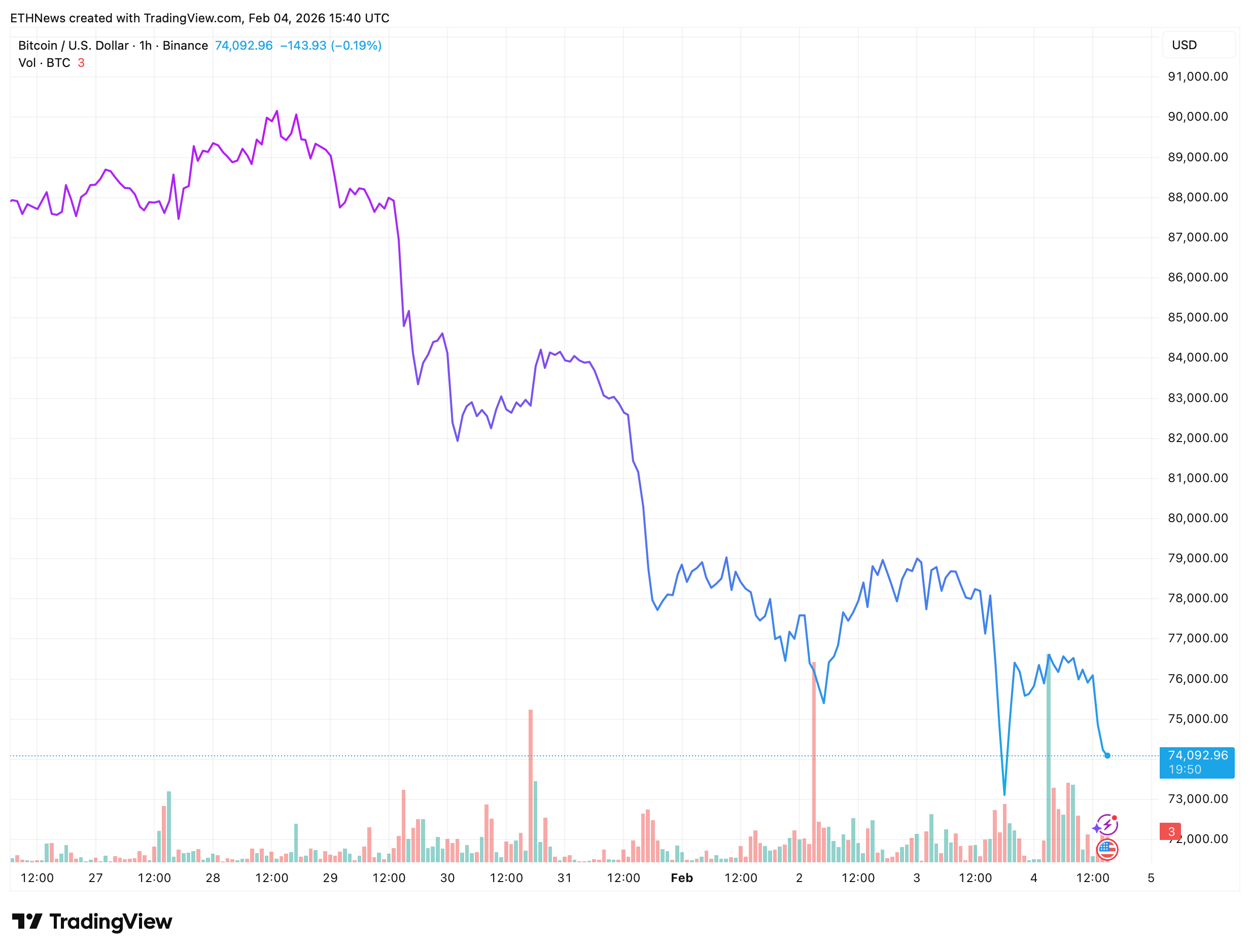 最新跌势将比特币推回74000美元附近,该价位在近期多次减缓跌势。下行过程中成交量有所放大,但未能形成持续跟跌,暗示抛压正在被吸收而非强势延伸。