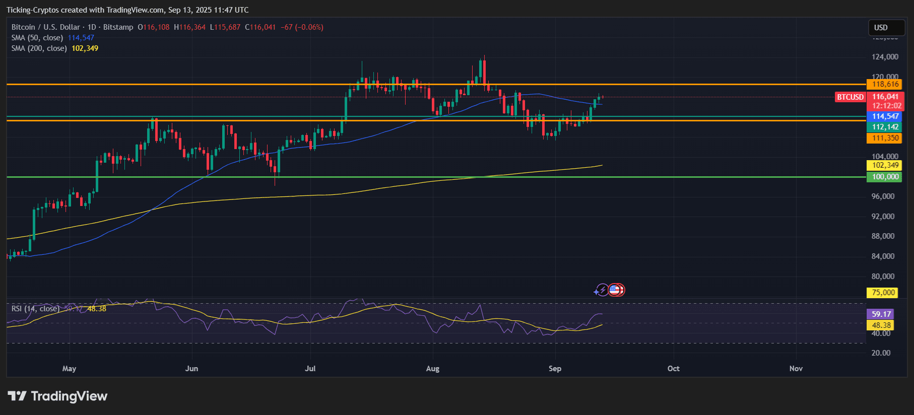 相对强弱指数(RSI)目前处于59的健康上升趋势,尚未进入超买区域,显示当前买盘压力适中。若比特币能站稳50日均线并突破118,000美元,下一目标将看向120,000至122,000美元区间。