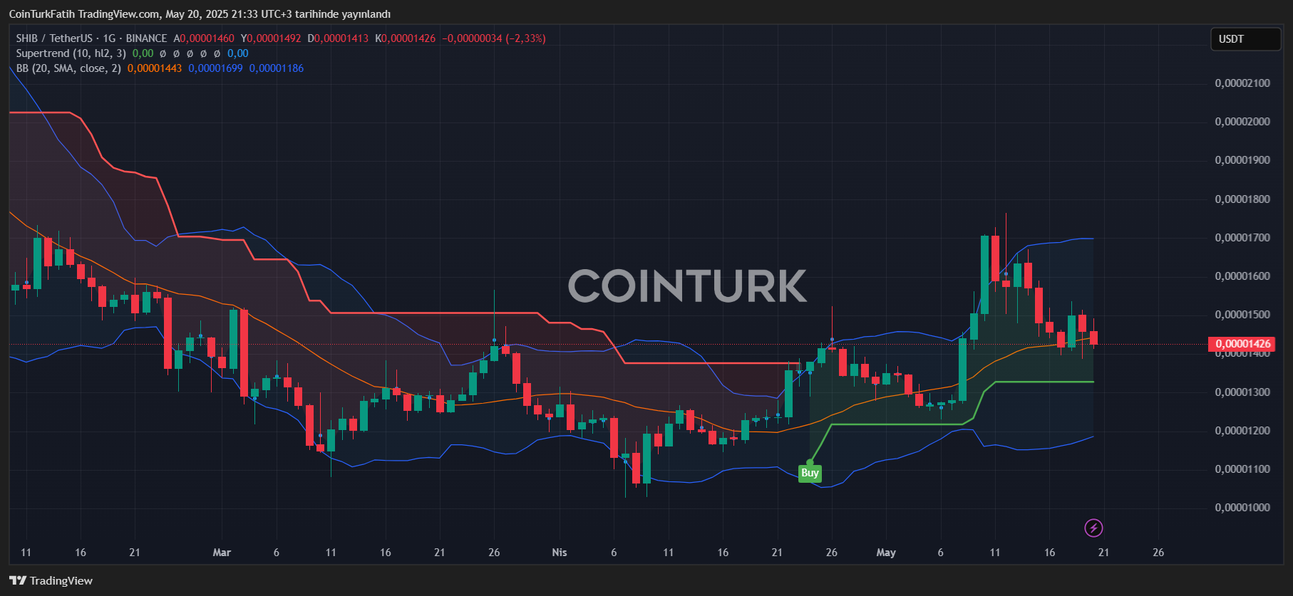 ShibaCoin目前维持在0.00001413美元的支撑位上方,显示出显著的波动性和上影线。虽然与关税相关的协议最初推动SHIB升至0.00001765美元,但未能突破这一水平。目前SHIB位于0.0000137美元支撑位上方,若能收于0.000015美元之上,可能会启动更强劲的反弹。