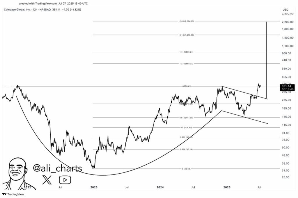 在Coinbase股价持续攀升之际,市场专家对该资产未来走势也持乐观态度。分析师Ali Martinez在社交平台X指出,Coinbase股票"正突破多年杯柄形态",该技术形态表明长期目标可能指向2000美元关口。