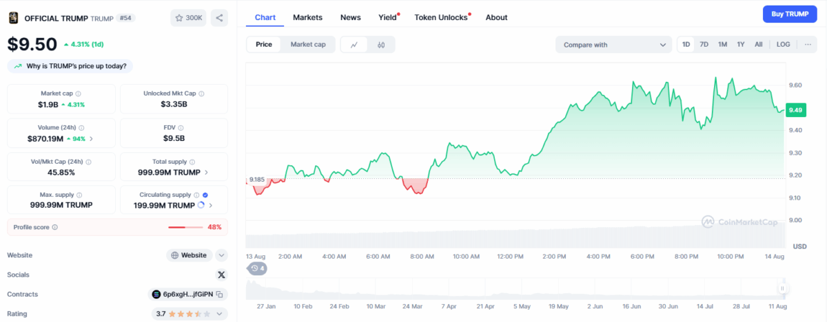 ETF注册消息立即在基于Solana区块链的Trump Coin模因币交易者中引发强烈反响。CoinMarketCap数据显示,该代币过去24小时交易量暴涨94%。价格也同步上涨4%,目前交易价格为9.50美元,成交额达8.7亿美元。