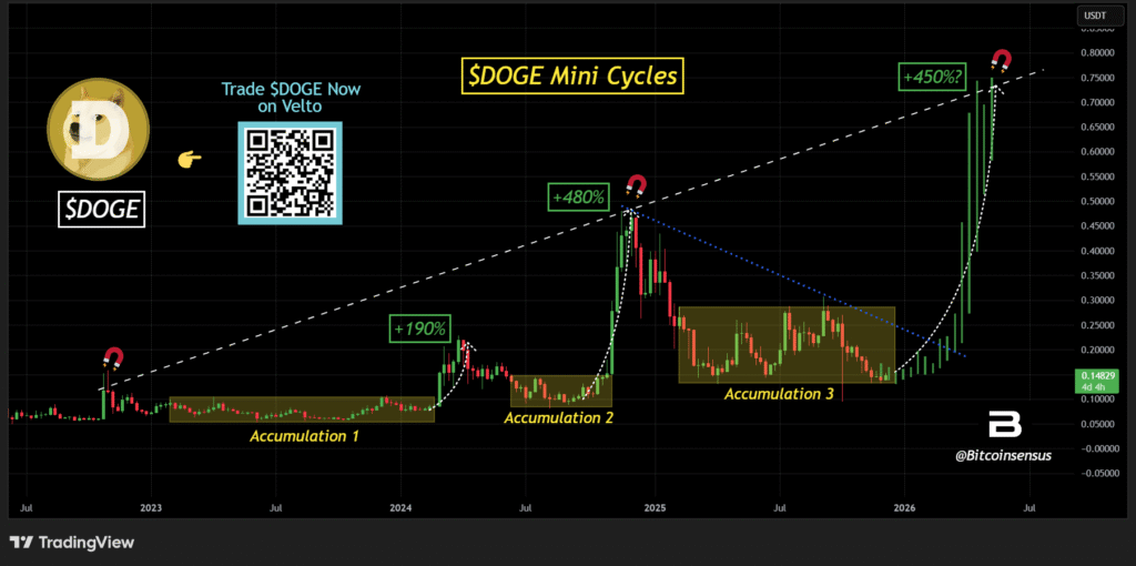 当前周期似乎正在复制这种结构。虽然具体时间节点无法确定,但历史走势表明积累阶段结束后,DOGE通常会迅速向下一目标位迈进。0.75美元附近的白色虚线阻力位已成为众多交易者重点关注的技术关口。