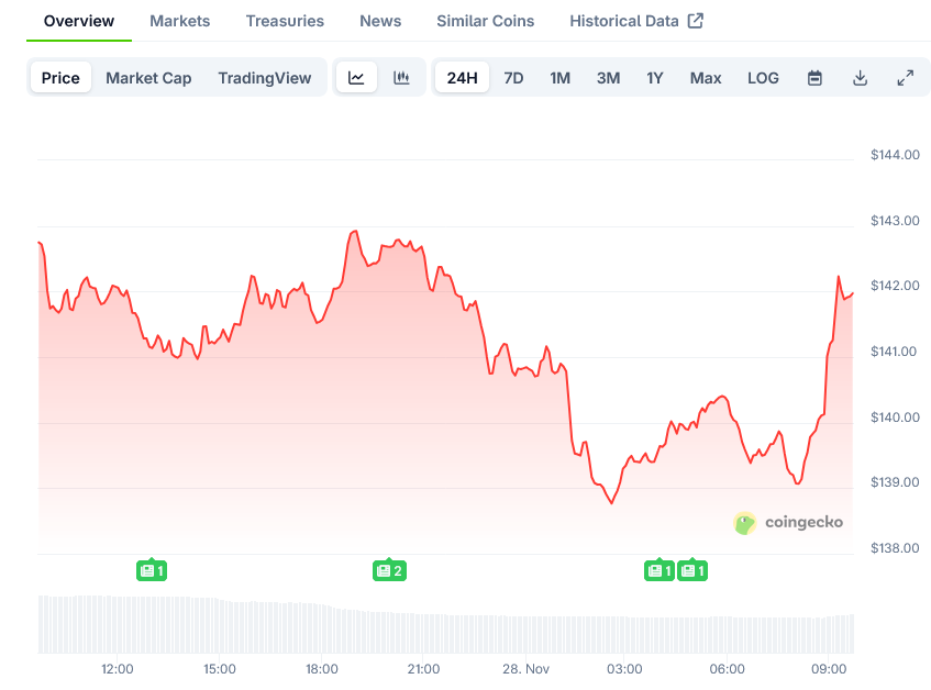 Solana现报约141美元,24小时上涨约3.6%。该代币过去30日内仍下跌约30%,较293.31美元的历史高点下跌逾50%。