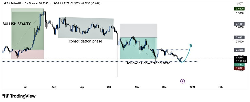 在经历长期下跌趋势和疲弱整理阶段后,XRP守住了关键支撑位,目前交易价格接近1.93美元。随着下降楔形形态的形成,若能突破2.00美元关口,可能确认短期看涨复苏。尽管社交媒体负面情绪升温,但历史数据显示此类趋势往往先于价格上涨。