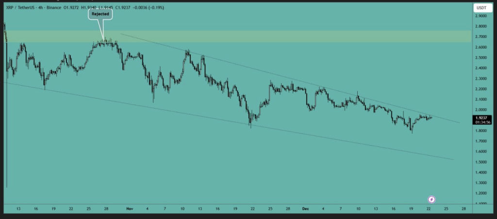 尽管存在反弹迹象,XRP仍面临市场负面情绪。据Crypto VIP Signal™报道,价格仍处于下跌趋势中,并形成小型下降楔形形态。该形态表明若突破2.00美元阻力位,价格可能实现向上突破。