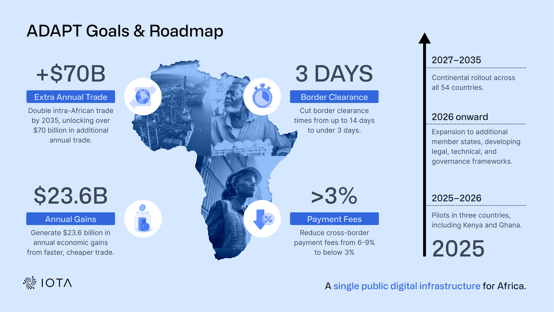 非洲正站在贸易变革的临界点。IOTA与国际领先机构合作,通过数字化手段重构货物、数据及支付的全大陆流通体系,预计将释放数百亿美元新增贸易价值并推动经济普惠发展。