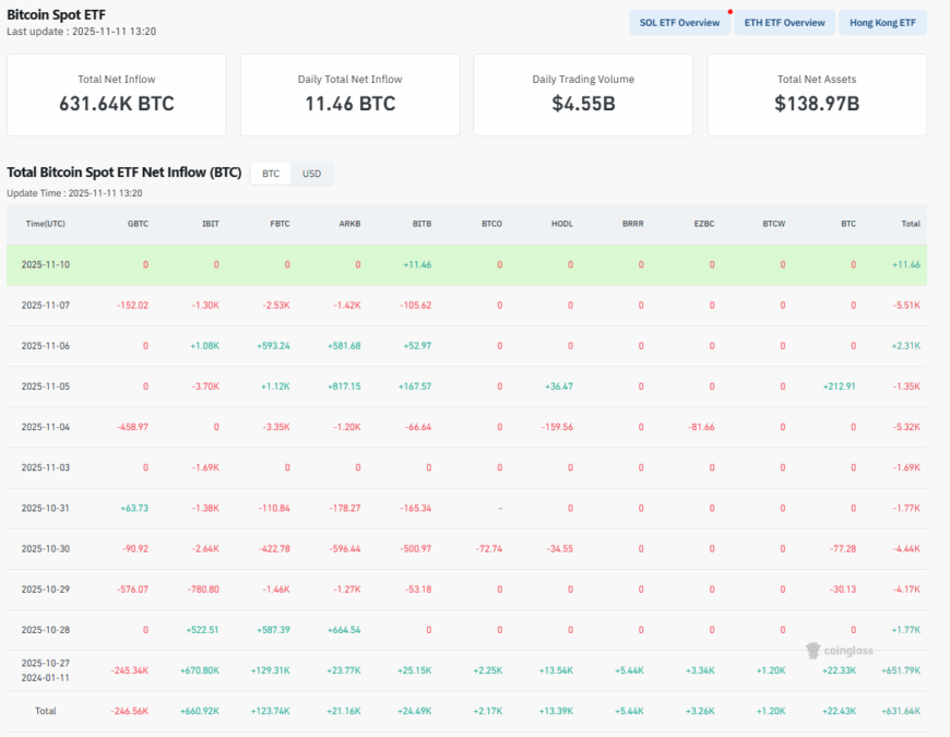 ETF资金流虽每周波动,但整体保持净流入。2025年11月10日,所有ETF合计净流入11.46 BTC,较本周早些时候流出的5,511 BTC实现快速反弹(Coinglass 2025年11月11日)。由贝莱德iShares比特币信托(IBIT)和富达FBTC引领的资金流入,悄然消化了抛压,助力比特币维持在10万美元上方。