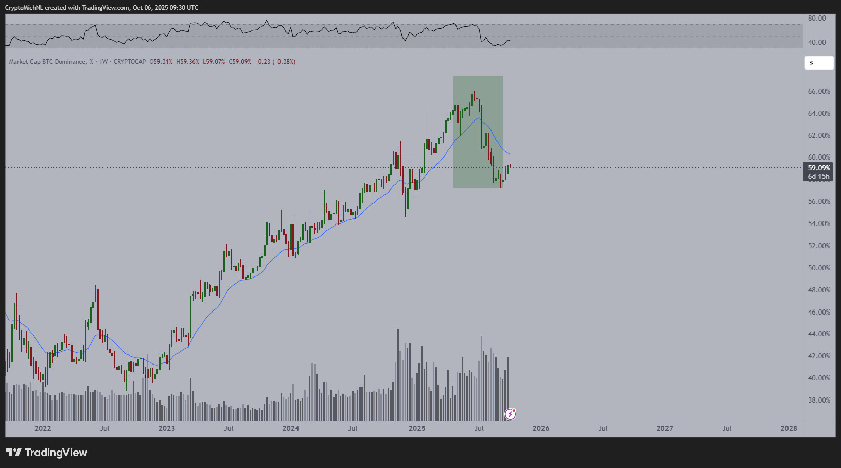尽管比特币走势强劲,部分分析师已观察到山寨币复苏的早期迹象。Michaël van de Poppe指出,比特币主导地位开始呈现下降趋势,这已推动以太坊从1500美元跃升至4800美元。
