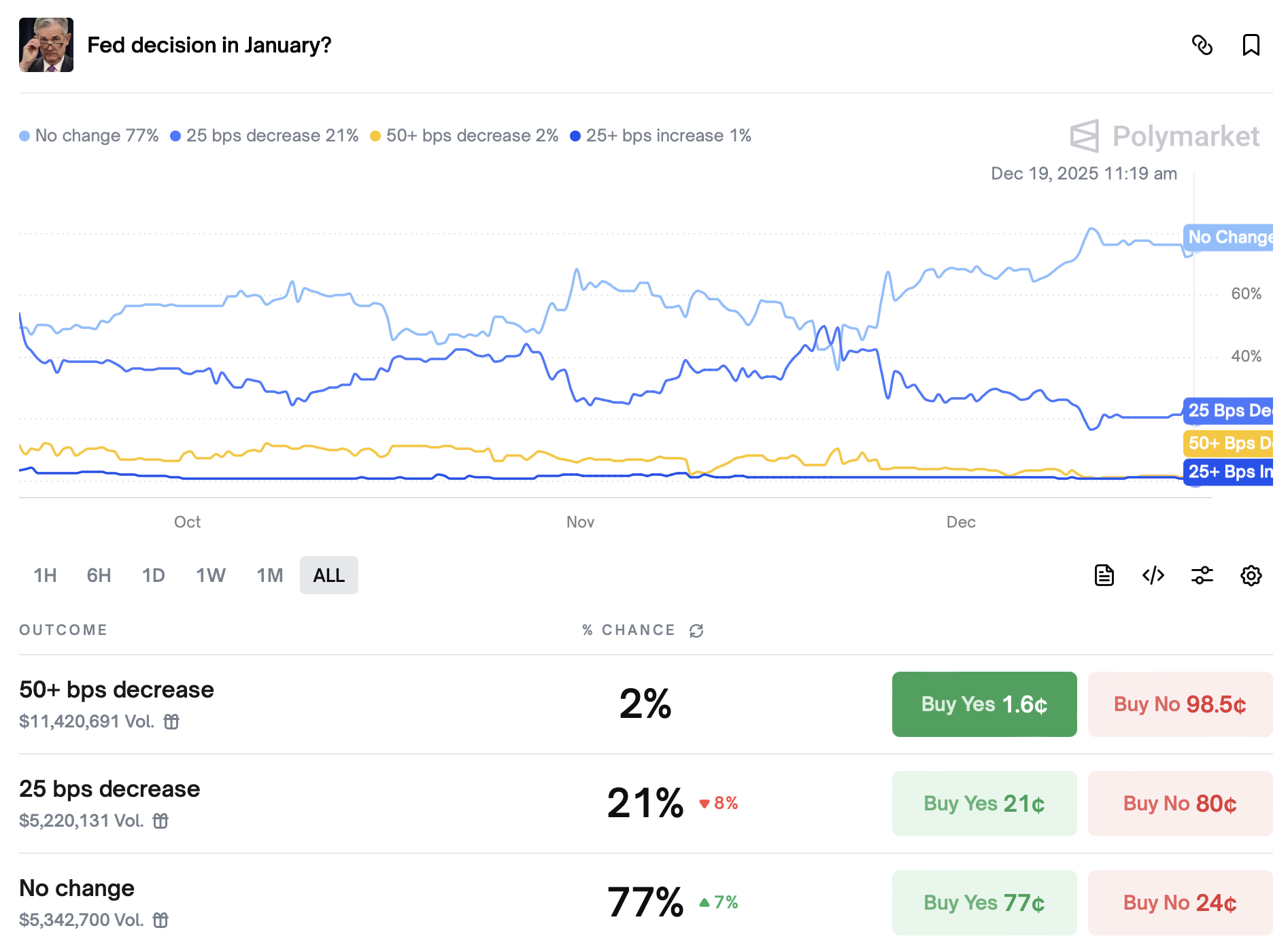 12月10日比特币交易价格约92,695美元,目前已回落至87,300美元左右。Polymarket市场共识显示,美联储1月维持现有利率的概率高达77%,进一步降息25个基点的可能性仅21%,表明短期内重大政策转变可能性较低。