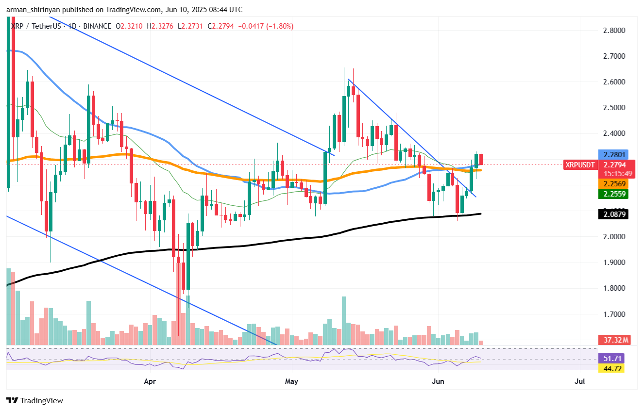 在2.08美元附近测试200日均线支撑位后,瑞波币显著反弹。该支撑位形成坚实基础,吸引多头动能推动资产突破关键阻力位。当前2.27-2.28美元的价格走势显示在均线上方进行健康盘整,表明正处于积累阶段而非派发阶段。