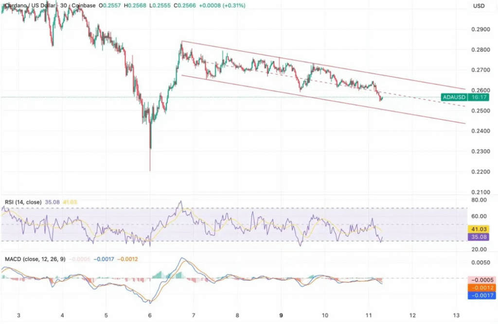 在较短时间框架(如30分钟图)上,ADA价格受限于下降通道内,目前正测试0.2555美元附近的通道下轨。相对强弱指数接近超卖区域,平滑异同移动平均线继续呈现看跌趋势。尽管出现微弱的反弹尝试,但卖方仍掌控局面,阻碍任何有意义的回升。价格目前在通道下轨附近震荡,若跌破0.255美元,则可能进一步下探0.25美元。