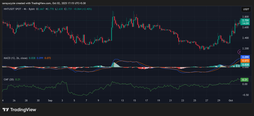 HNT成功突破2.53-2.72美元关键阻力区。截至撰稿时,氦气币报2.72美元,市值达5.0394亿美元。不过其日交易量下降6%,现报2015万美元。