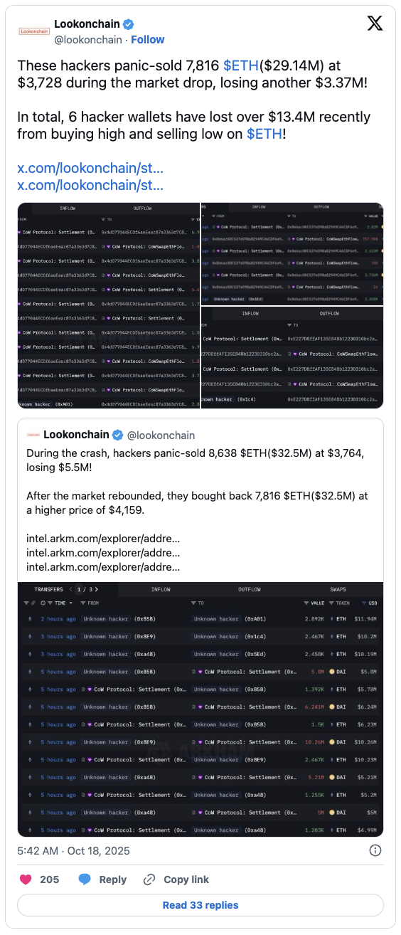 链上数据显示,这些黑客倾向于在价格上涨时买入,在下跌时恐慌抛售。根据Lookonchain从Arkham Intelligence获取的数据,这些黑客上周抛售8638枚ETH后又回购了7816枚ETH,结果在近期暴跌中再次抛售这些资产。