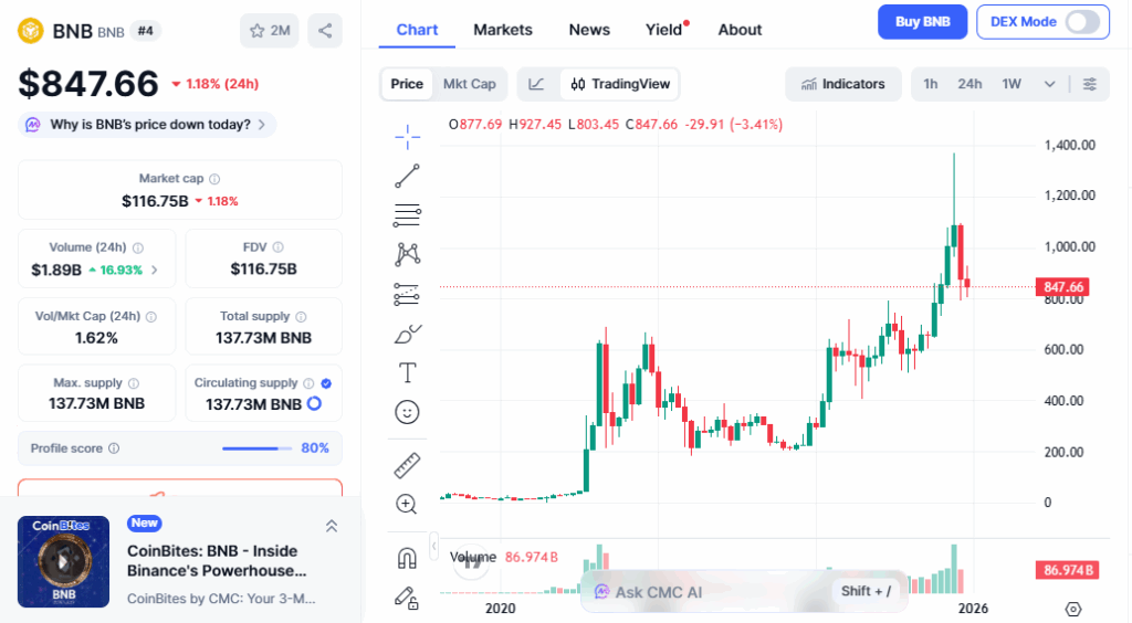 随着香港为机构加密投资建立框架,2026年BNB价格预测日益看涨。截至12月23日,BNB交易价约847美元。
