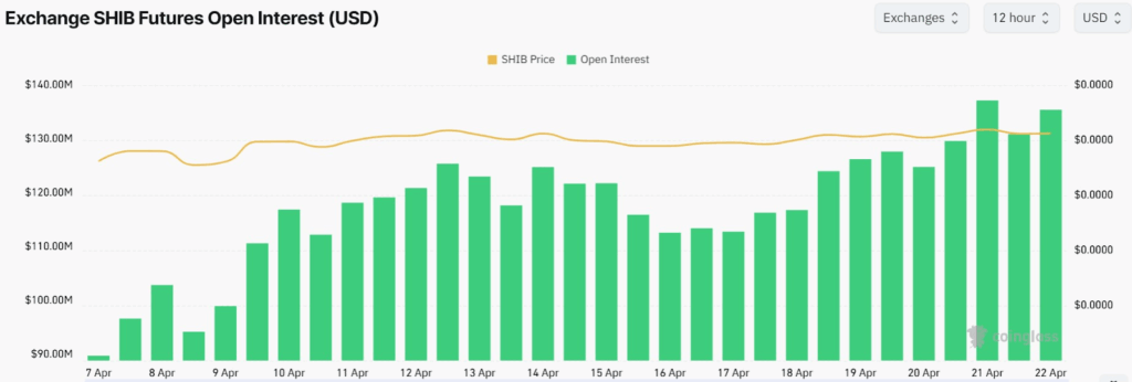 Coinglass的数据显示,SHIB的未平仓合约在短短两周内上涨了43%。未平仓衍生品合约已从9400万美元增加到1.35亿美元。这可以归因于交易员预计市场将出现重动。