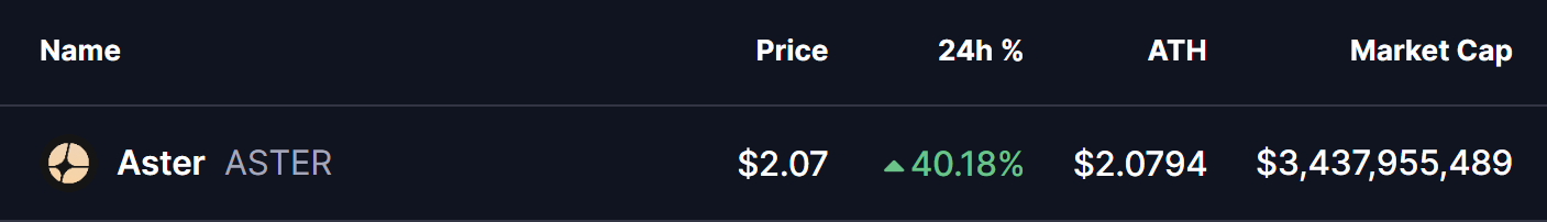 今日ASTER涨幅超40%,创下2.07美元的历史新高,突破此前1.99美元的峰值。这轮上涨源于其亮眼的链上表现,目前ASTER已在关键增长指标上超越竞争对手Hyperliquid(HYPE)。