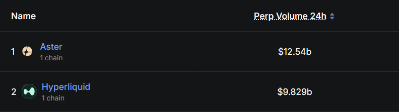 据DefiLlama实时数据,Aster以125.4亿美元的24小时永续合约(PERP)交易量位居榜首,超越排名第二的Hyperliquid(98.2亿美元)。