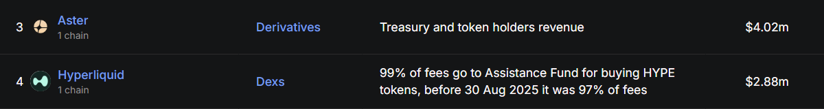 交易活动的激增直接带动平台收入增长。过去24小时,Aster以402万美元收入位列第三,Hyperliquid则以288万美元紧随其后。